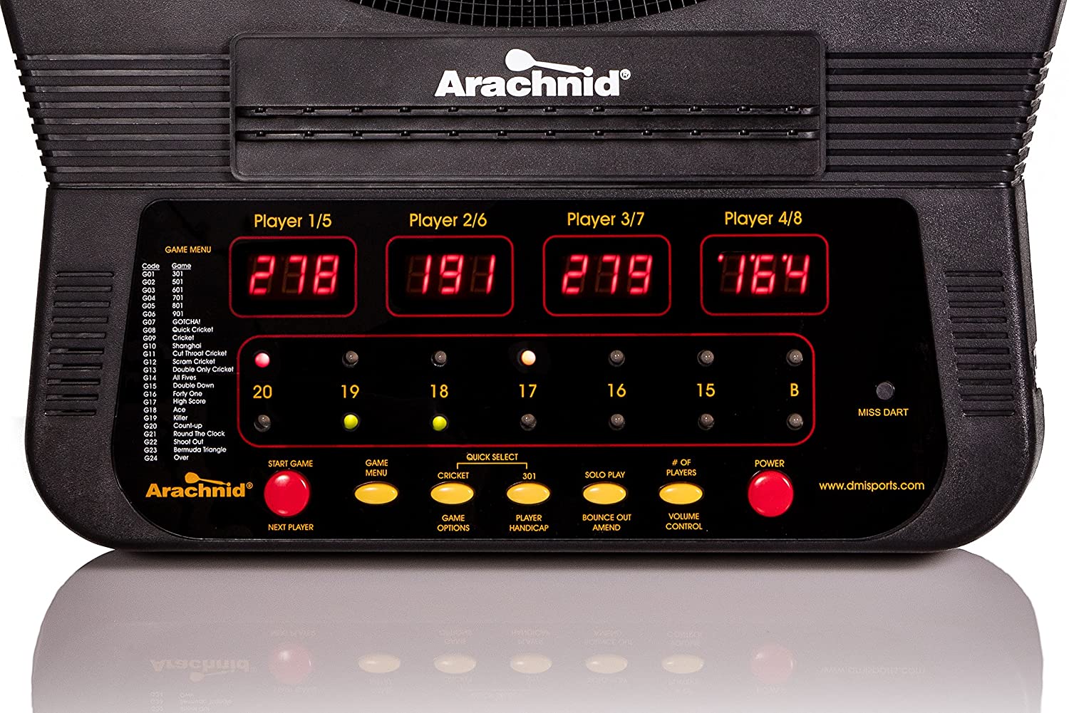 The Arachnid Cricket Pro 650 is an electronic dart and scoreboard combo piece, with 24 games and 132 options to choose from. This model has a classic look, with NylonTough segments and micro-thin dividers, a regulation playing area, a four-player score display for up to eight players, and an adjustable volume.