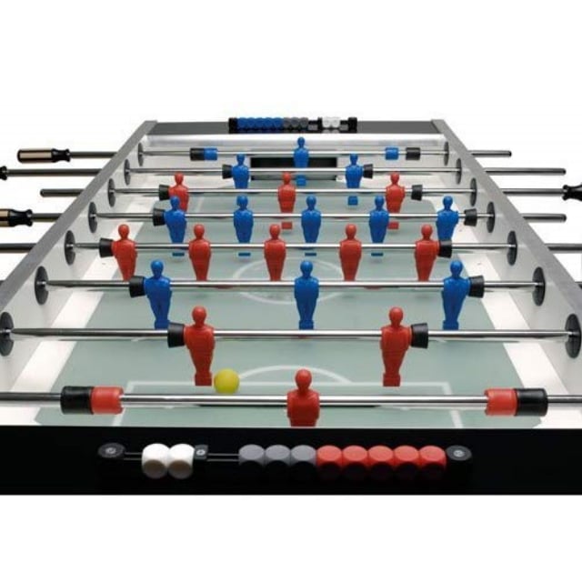 Unlike the majority of foosball tables with playing surfaces made of MDF wood, this model features a green playing field made of tempered sanded glass to provide a smooth surface for a true roll of the ball. The field supported by two adjustable steel bars for optimal stability and stress resistance can be detached for cleaning or repairs.