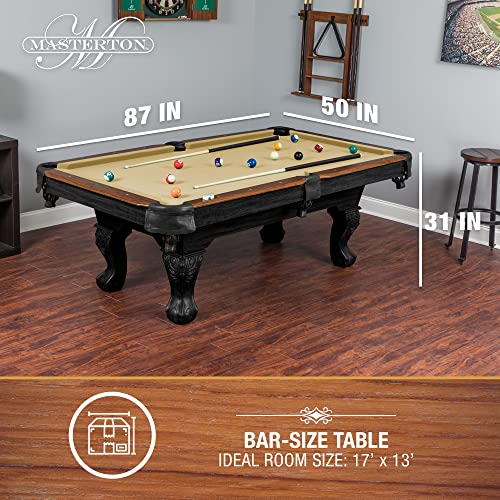 Measuring 87 inches long, 50 inches wide, and standing 31 inches high, the Masterton is considered a bar-size table, perfect for most residential spaces but large enough to deliver an authentic billiards experience. Before purchasing, it is recommended to ensure that your game room can comfortably accommodate both the table and ample cue space—an area of at least 17 by 13 feet is ideal for unimpeded play.